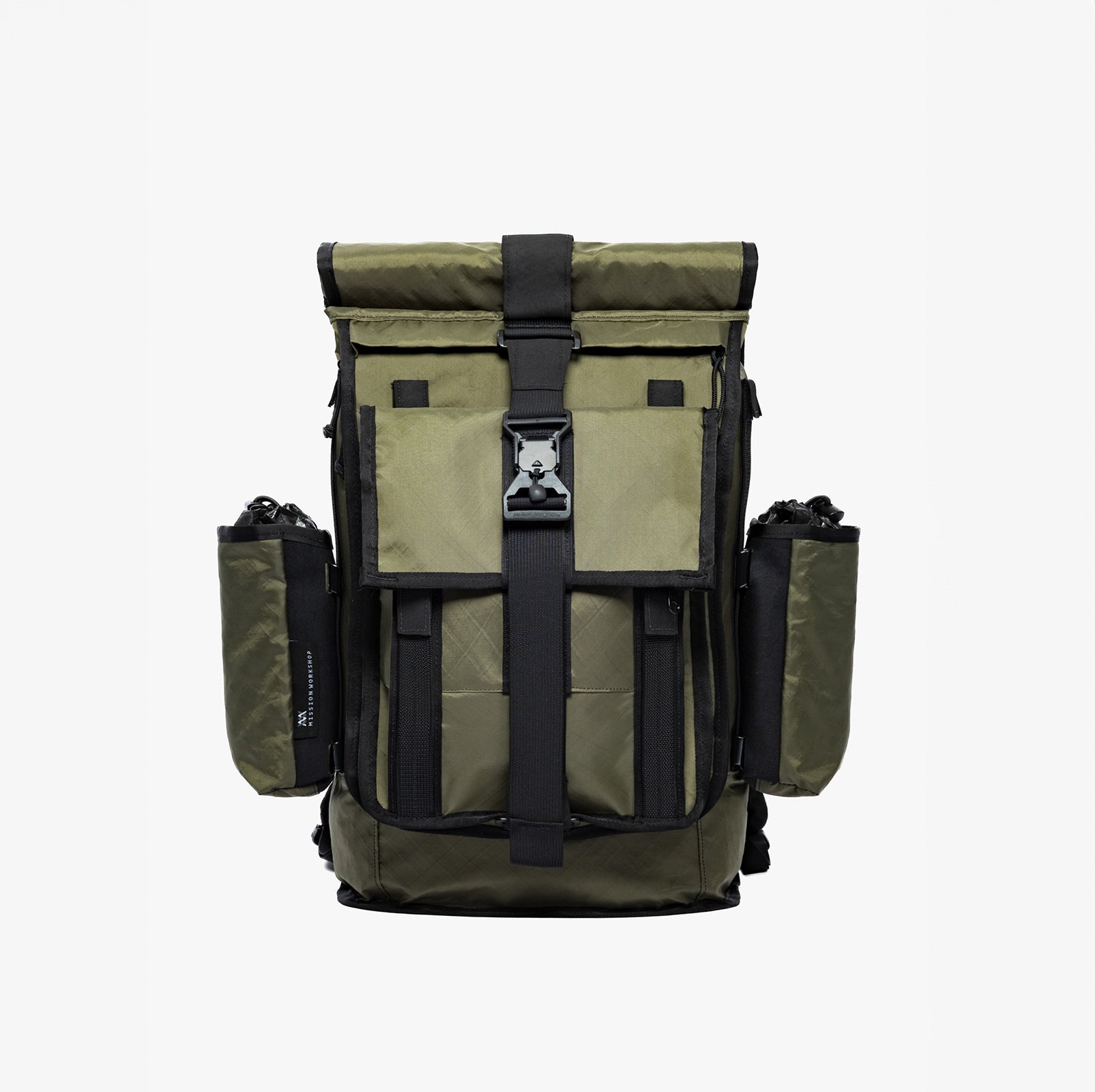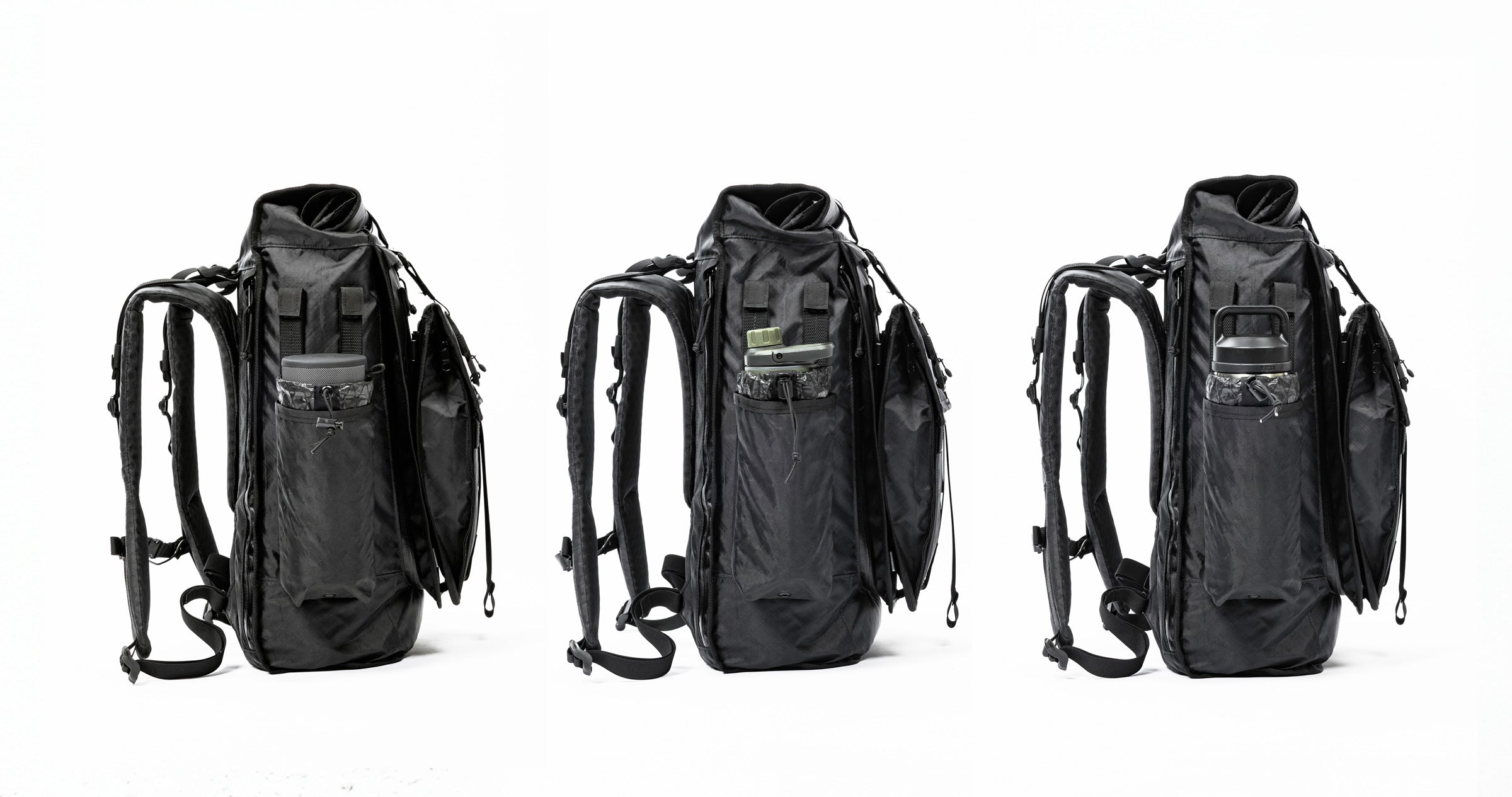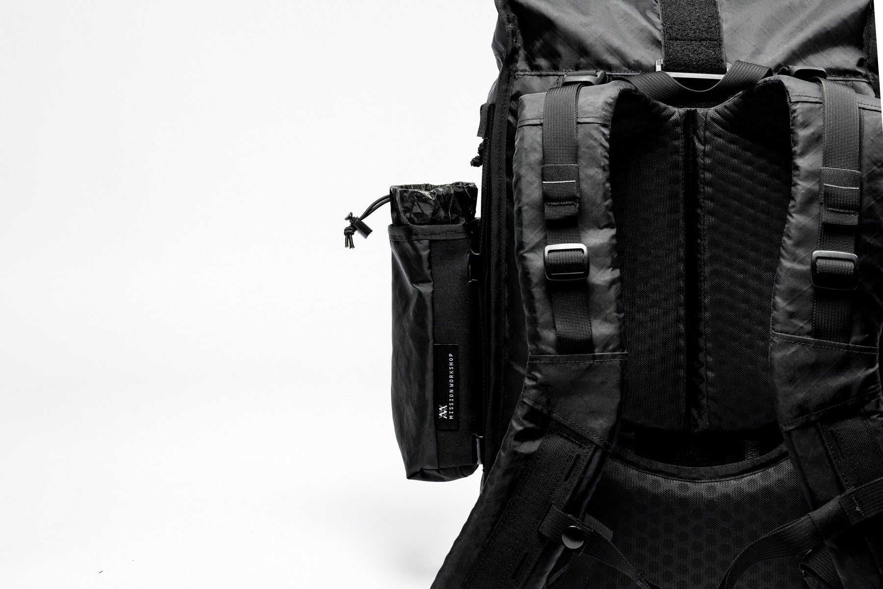 Versatile external storage for water bottles, food, and gear. Compatible with all Arkiv modular backpacks. Features a convenient elastic drawstring closure and a brass grommet drain hole.