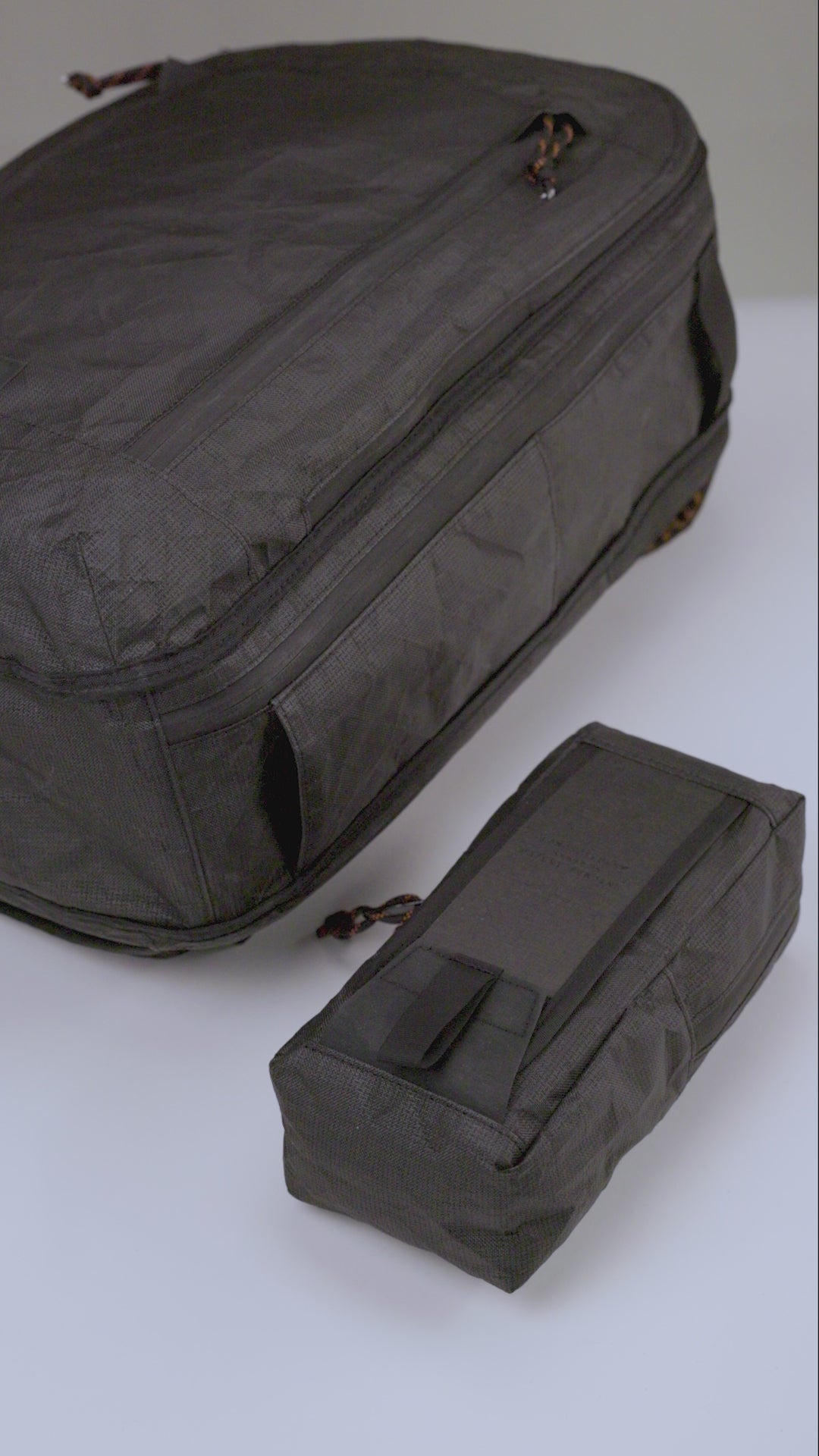 The full clamshell opening simplifies packing of the main compartment, and a dedicated tech compartment with organizer pockets and a carabiner clip secures keys and other daily essentials. A dual-access front admin panel with vertical external zippers provides immediate access to travel documents, AirPods, sunglasses, and other everyday carry items. Additionally, a top-access, rear-mounted, padded laptop sleeve offers easy access and protection from physical damage and weather. Featuring US made mil-spec, matte finish YKK Aquaguard zippers throughout.