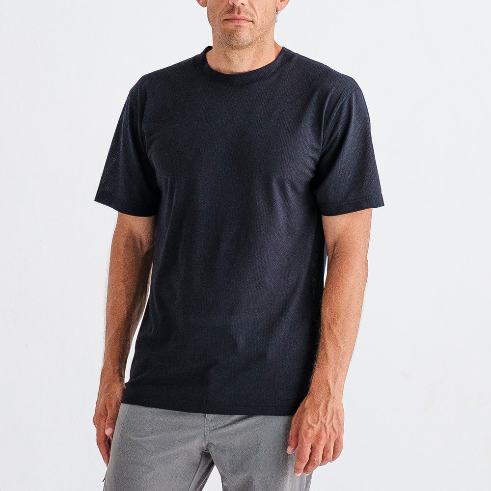 The Mission Tee: Quick Dry is made from Italian open-knit dimensional mesh, engineered to enhance surface area for outstanding breathability. Its dual-yarn construction effectively pulls moisture away from the body, keeping you dry and comfortable in all conditions.