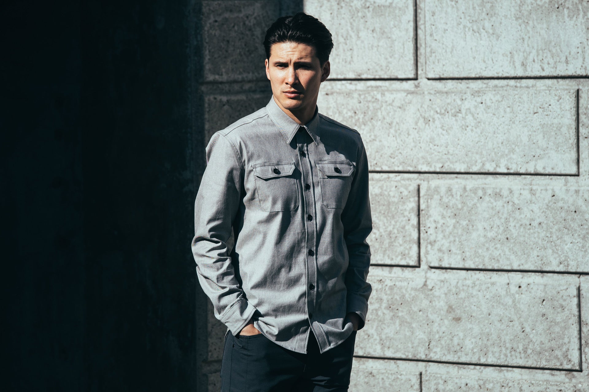 The beautiful stretch cotton has a subtle texture and a tough-but-refined look and feel. Can be worn as a stand-alone shirt or as a lightweight jacket alternative and features two chest pockets and articulated sleeves.