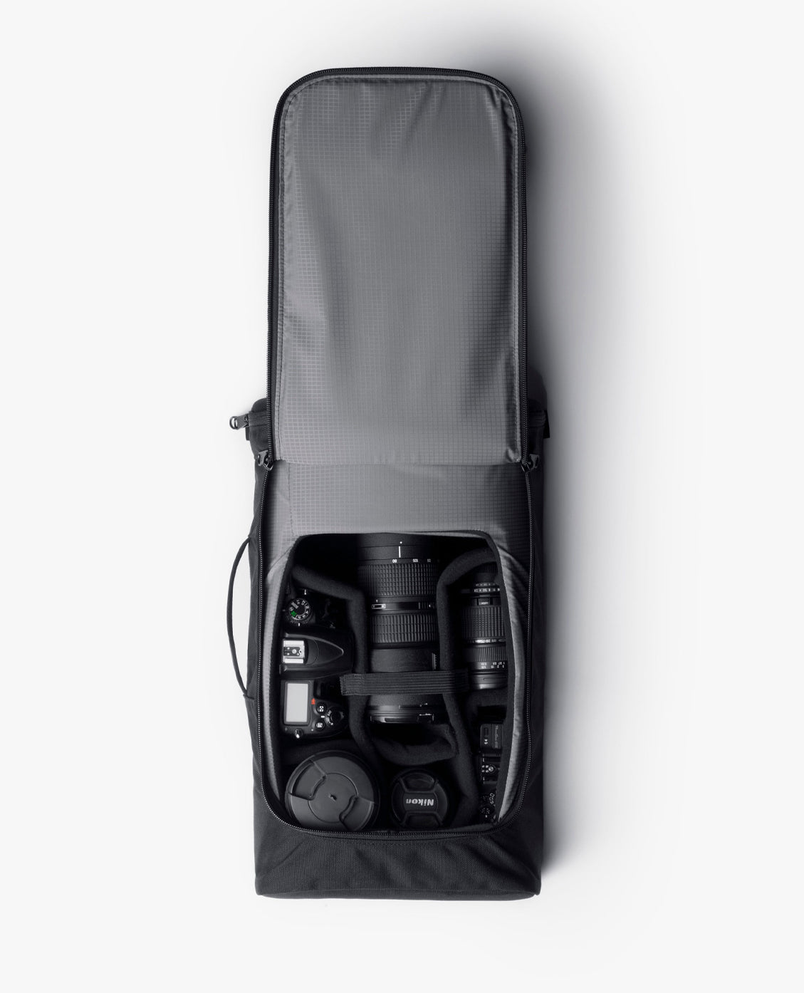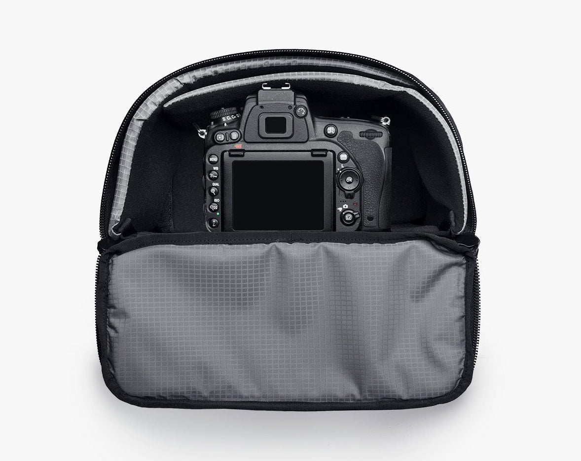 Gear inside the Capsule can be accessed from the top panel or the front panel. The top section is specifically designed to hold a DSLR or mirrorless body with almost any size lens that can be accessed directly without having to remove the Capsule from your bag.