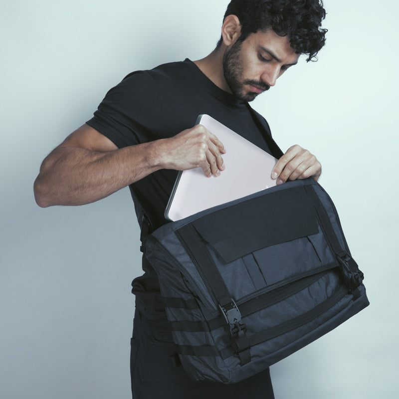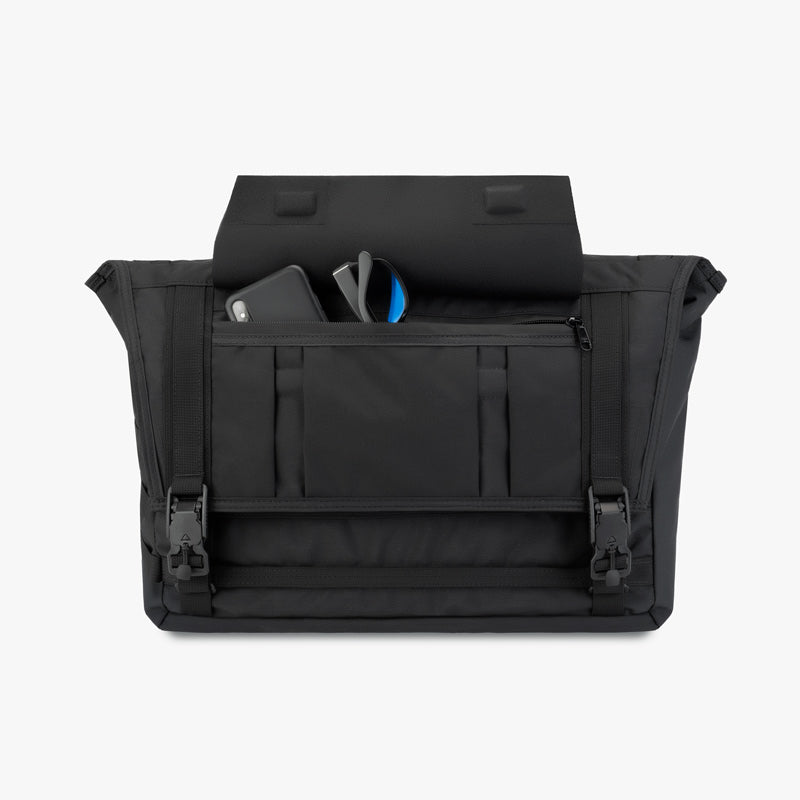 The adjustable shoulder strap is equipped with a removable ventilated shoulder pad, and can be upgraded with our quick-adjust messenger shoulder strap assembly. Pocket configuration includes dedicated zippered waterproof laptop compartment, tricot-lined smartphone pocket, flat pocket for documents, multiple general org pockets, key clip, and large main compartment.