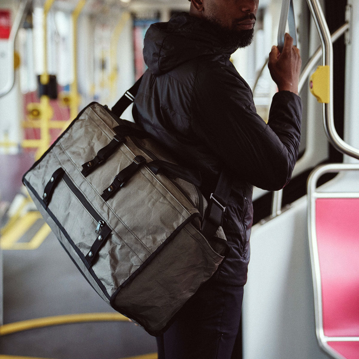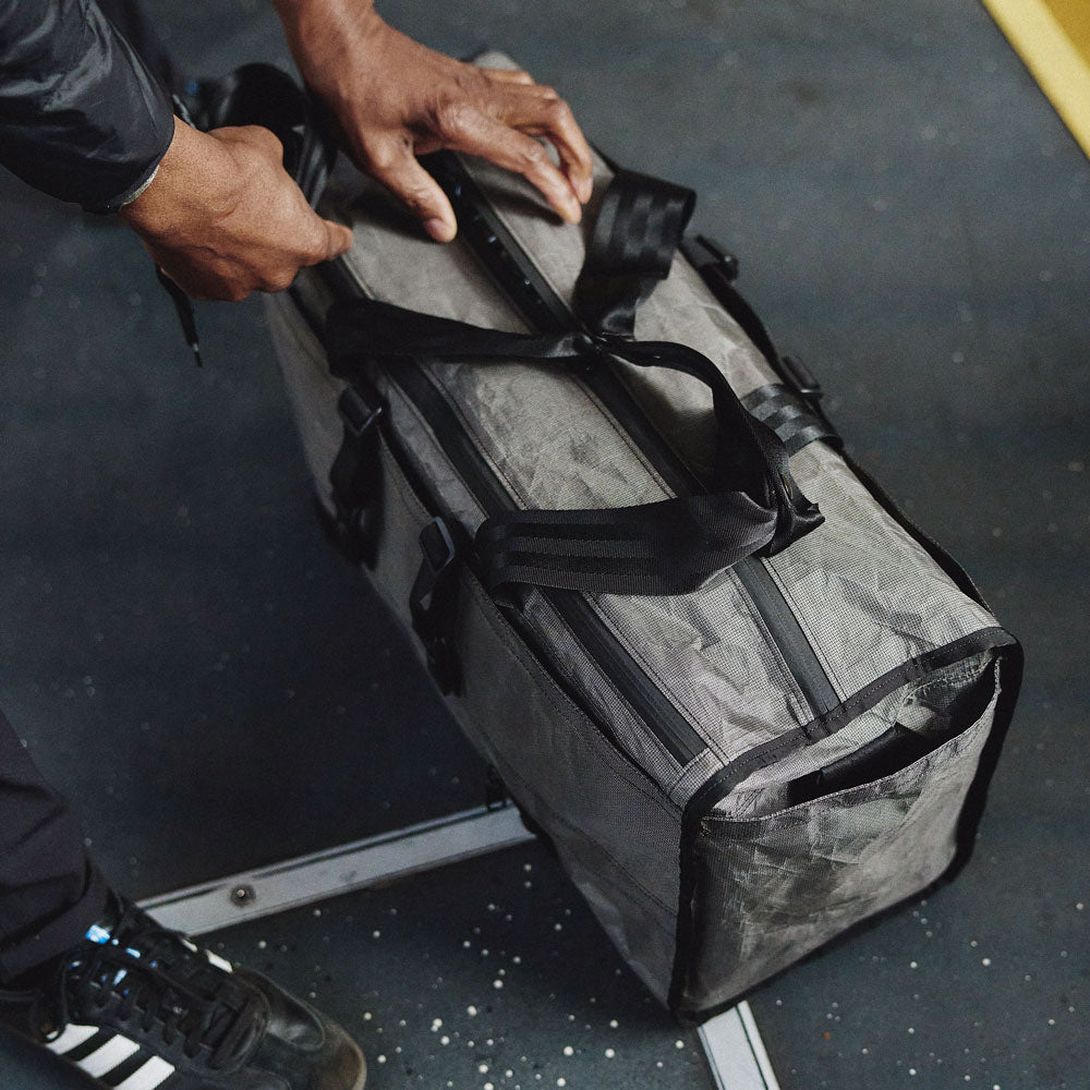 The Mass Transit can be carried using grab handles that tuck away when not in use or with a removable quick-adjust shoulder strap that features our custom aluminum hardware. The duffle also attaches to any porteur-style back rack using the integrated snap points. For hands-free travel, it can be worn as a backpack when paired with the optional harness.
