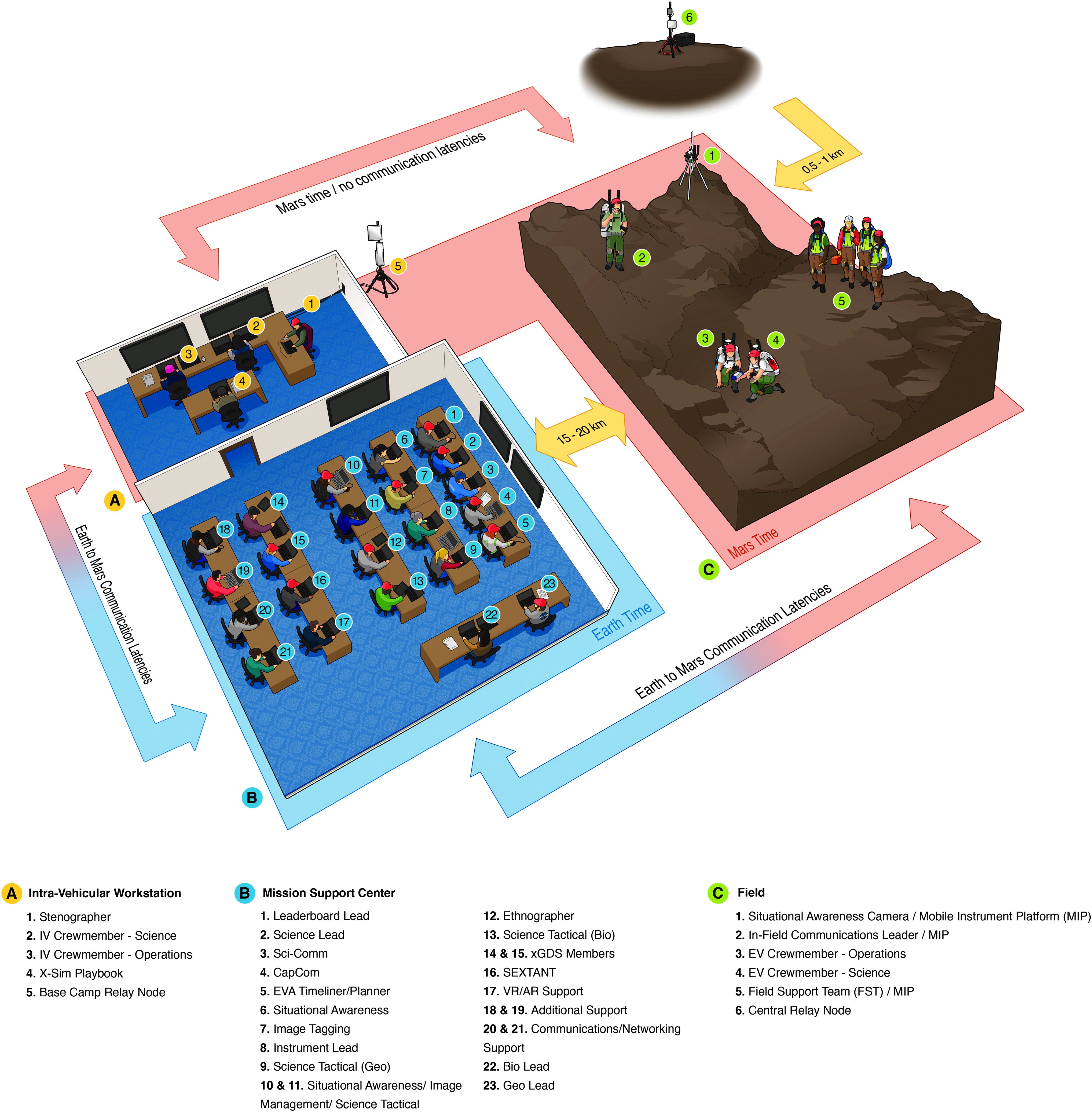 The simulated mission accounted for three teams: the astronauts on the ground (extravehicular or EVA), who communicated in real-time with the astronauts in an orbiting spacecraft (intravehicular or IVA), and mission control here on Earth, where a team of scientists was observing and analyzing all information and video collected by the EVA team. Here's how the team operated (Diagram below : Lim et al., 2019)