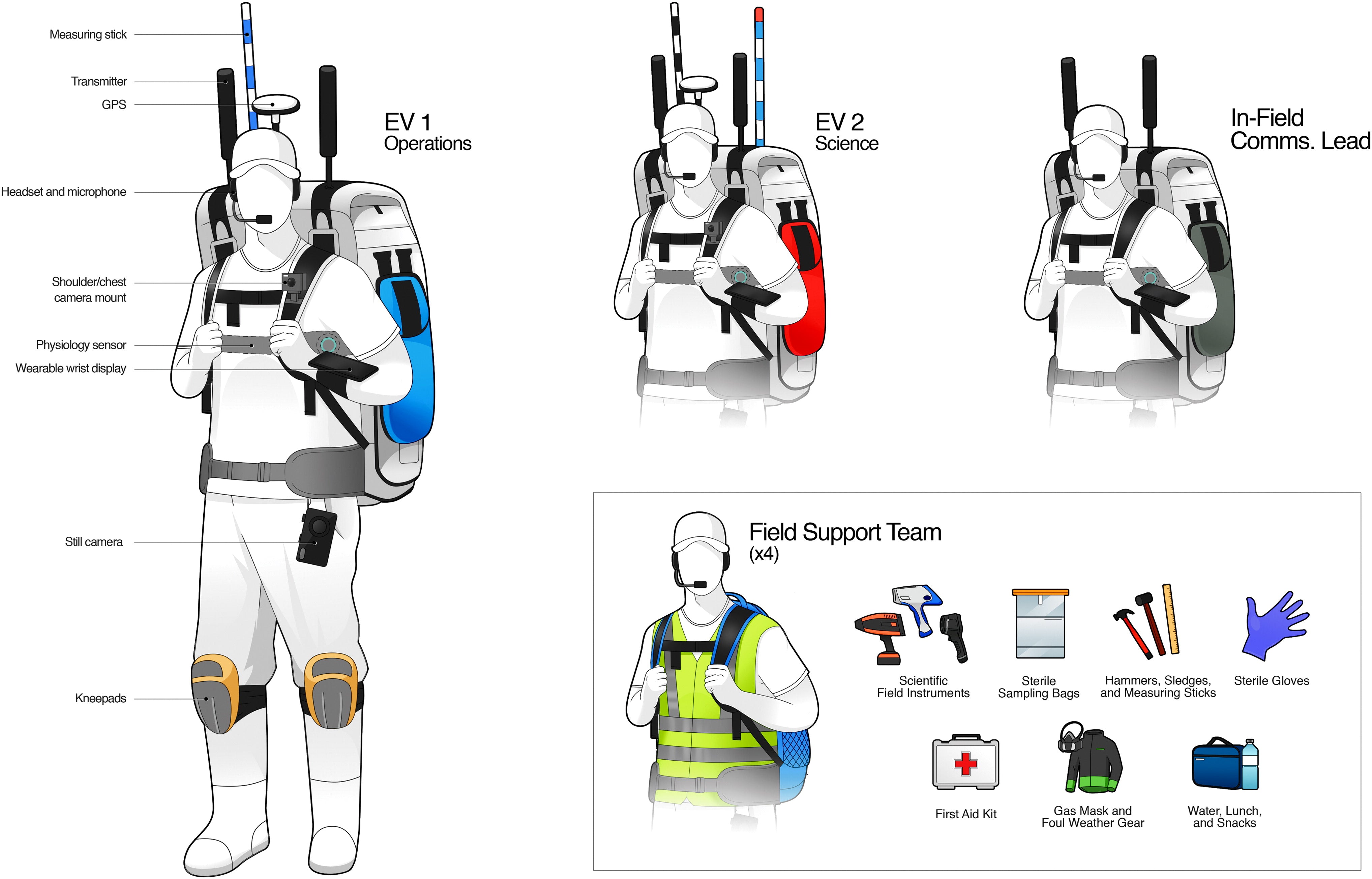 "The bags had to protect sensitive electronic equipment responsible for relaying BASALT-OnSight: an immersive, three-dimensional (3D), XR terrain modeling tool, HoloSkype: an AR technology that enables the drawing of virtual annotations on top of the real world by EV and IV crewmembers and facilitates real-time communication, and HoloSEXTANT: an AR capability that provides real-time navigation and path planning visualization overlaid on the physical world for EV crewmembers." (Abercromby et al., 2020)
